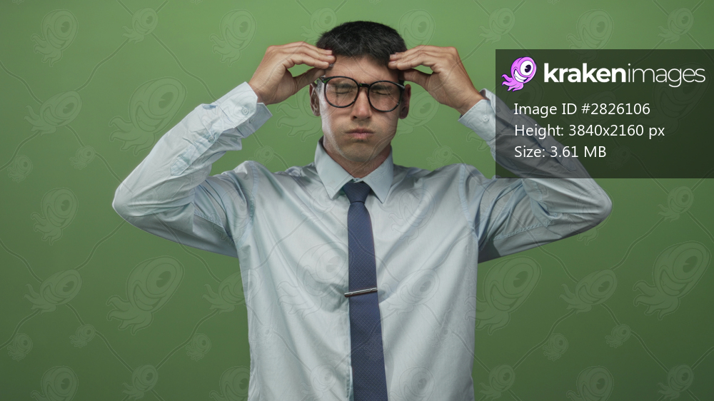 Young hispanic man in a light blue shirt and navy tie presses his temples in a green studio setting; headache tension anxiety pressure.