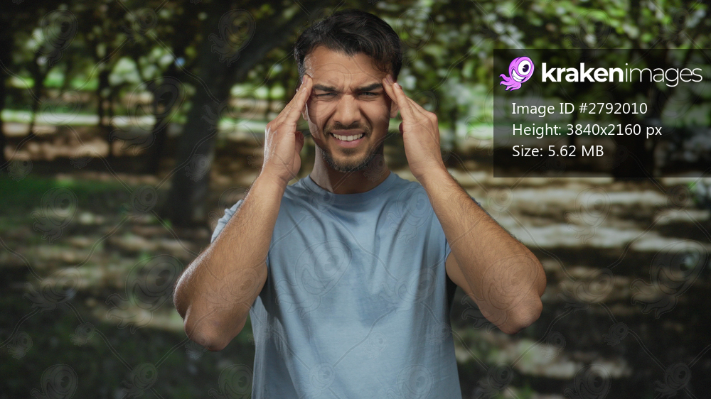 Young hispanic man in a park outdoors showing stress with his hands on his temples, surrounded by green trees and dappled sunlight filtering through the branches. - Kraken Images