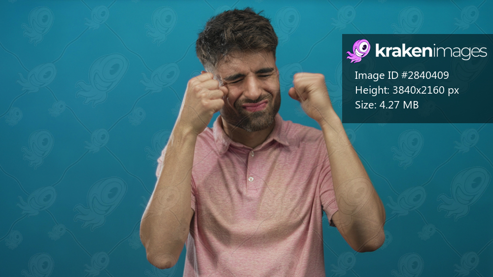 Young hispanic man in a pink shirt miming crying with fists to eyes against a bright turquoise studio wall; sadness.