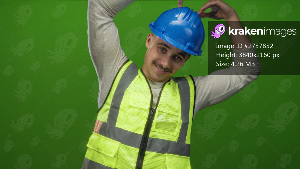 Young hispanic man in a reflective vest and hardhat makes a heart gesture with his hands against a green background with an isolated wall.