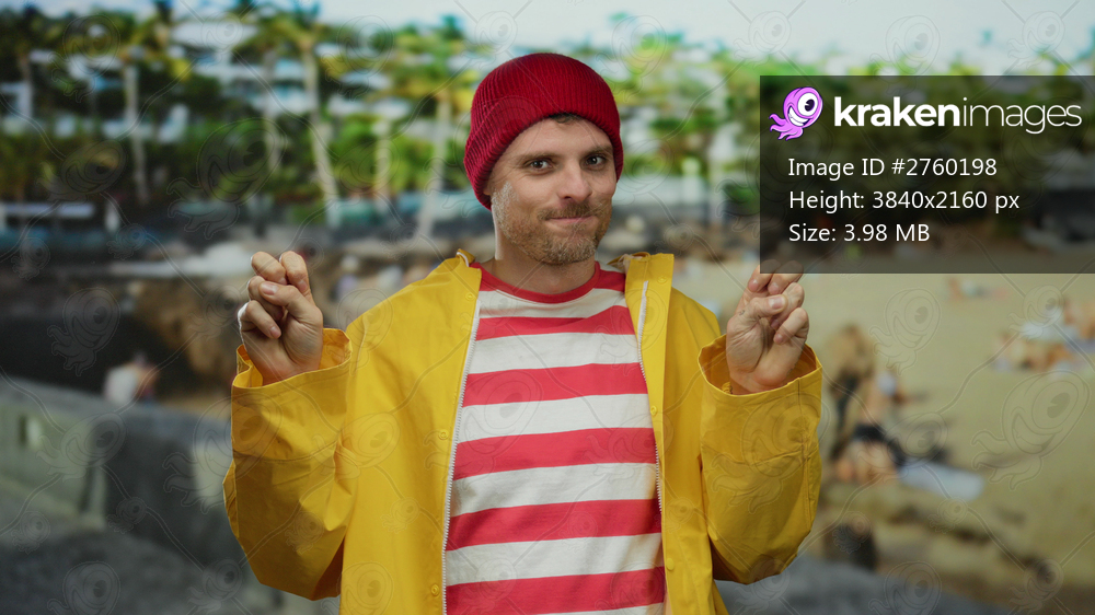 Young hispanic man in a striped shirt and yellow jacket smiling on a sunny beach with palm trees in the background.