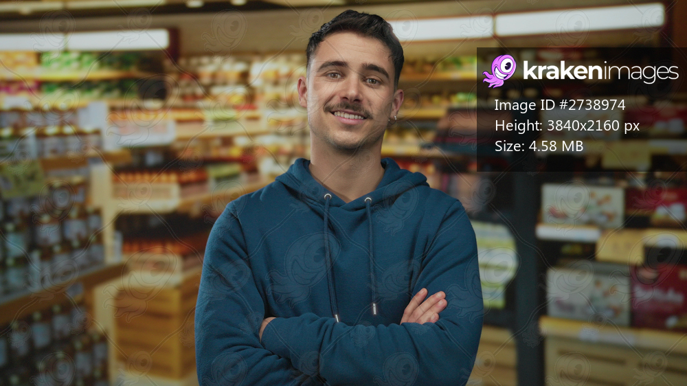Young hispanic man in a supermarket with arms crossed wearing a blue hoodie standing confidently among grocery shelves in an indoor market setting.
