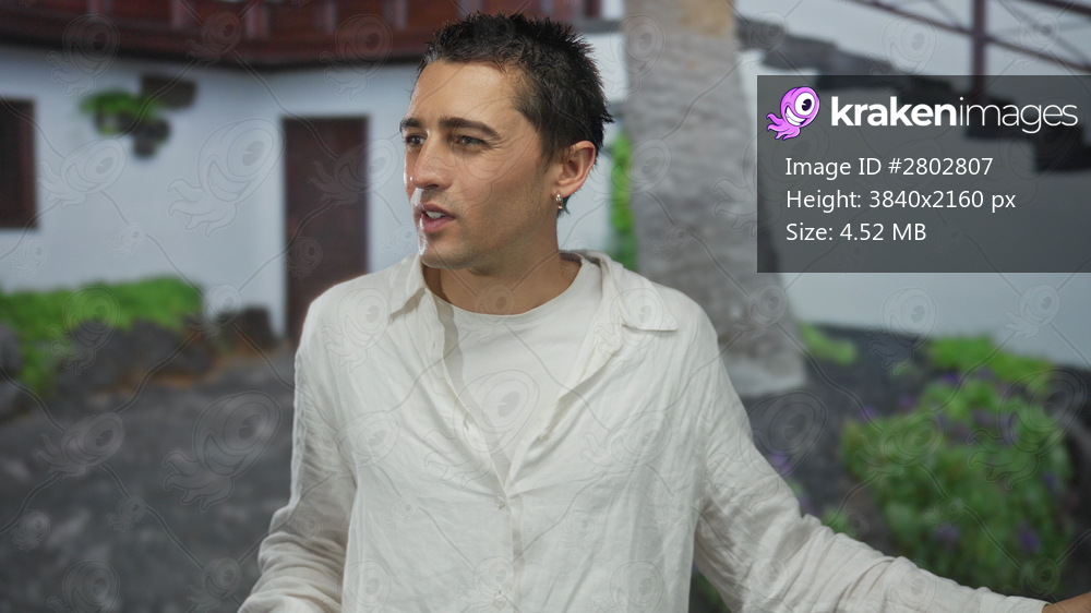 Young hispanic man in a white shirt outdoors near a rustic building, showcasing a casual and relaxed expression in a natural setting with greenery and stone pathway. - Kraken Images