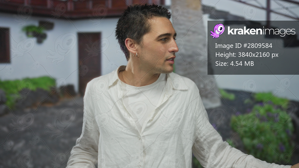 Young hispanic man in a white shirt outdoors near a rustic building, showcasing a casual and relaxed expression in a natural setting with greenery and stone pathway. - Kraken Images