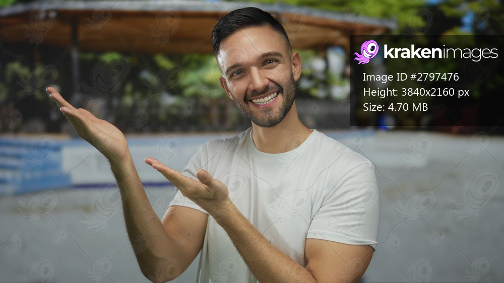 Young hispanic man in a white shirt smiling and extending his hands outdoors in a green park setting showcasing positivity and friendliness.