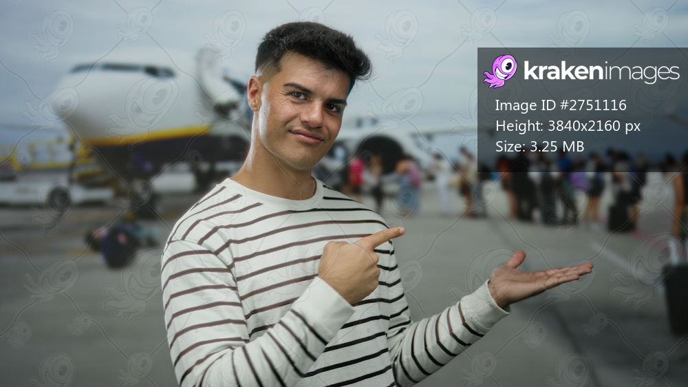 Young hispanic man in airport doing ok and pointing gestures with aircraft and terminal in background outdoors showing relaxed travel moment