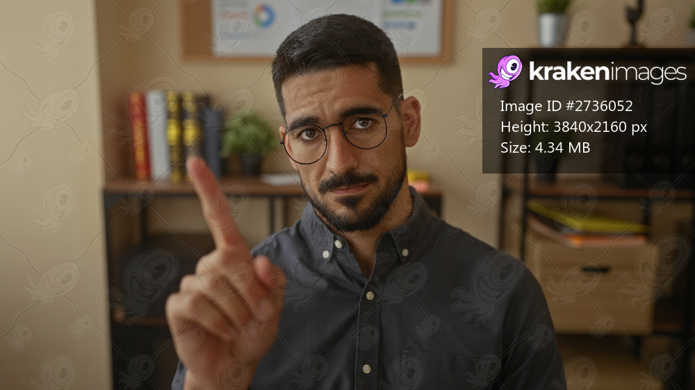 Young hispanic man in an office gestures no with finger against a background of shelves and books