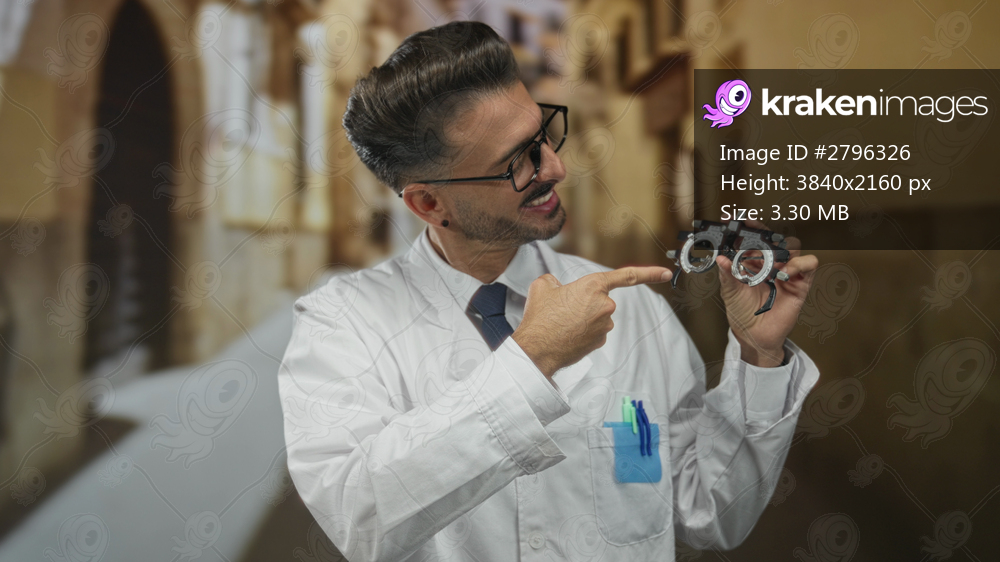 Young hispanic man in an old town street holds a phoropter testing device and points finger to its lens; confidence.