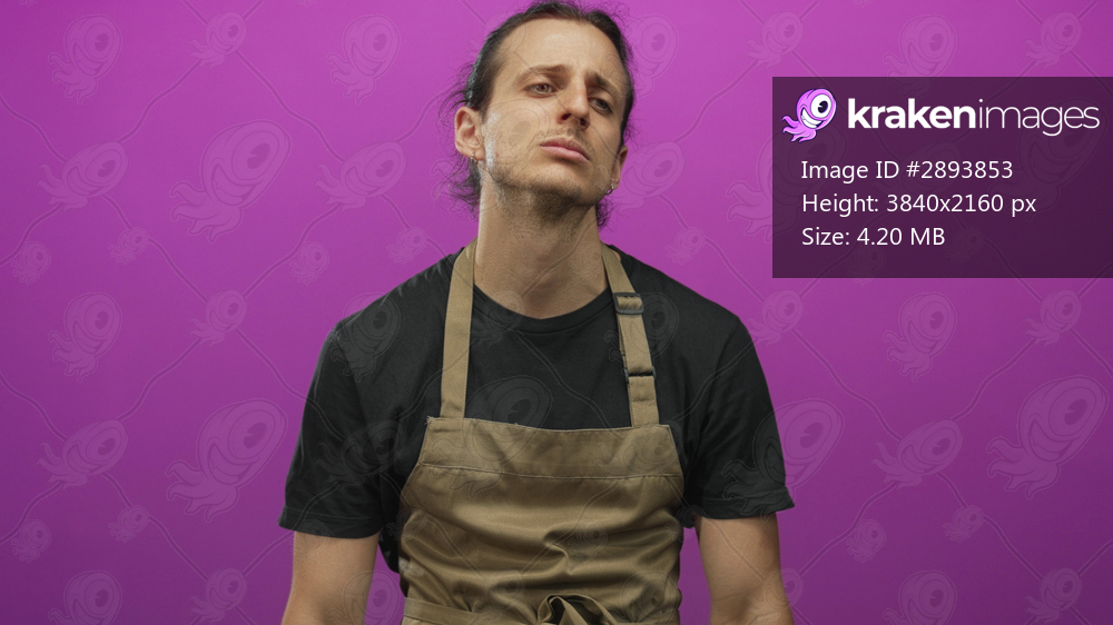 Young hispanic man in apron with head tilted back looking up in purple studio; weary introspection solitude.