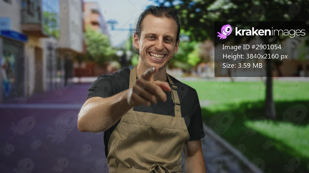 Young hispanic man in apron points finger forward on busy street with visible hands and broad laughing smile; joy.