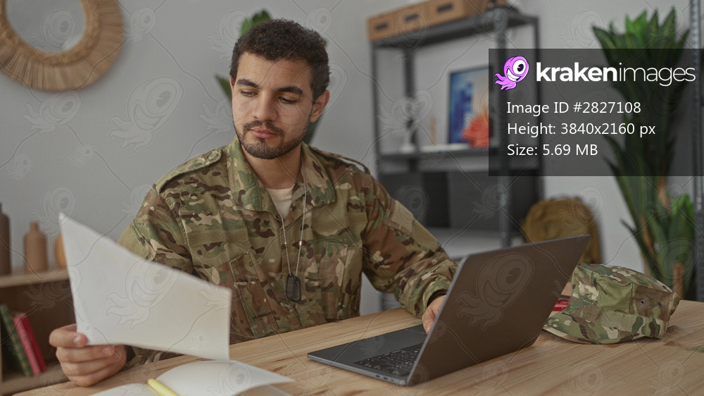 Young hispanic man in army uniform typing on laptop at wooden table in living room; discipline concentration.