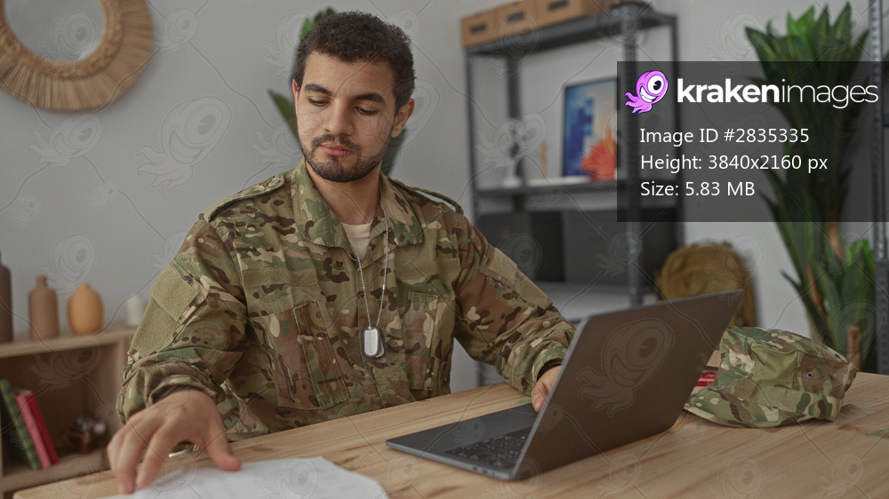 Young hispanic man in army uniform typing on laptop at wooden table in living room; discipline concentration.