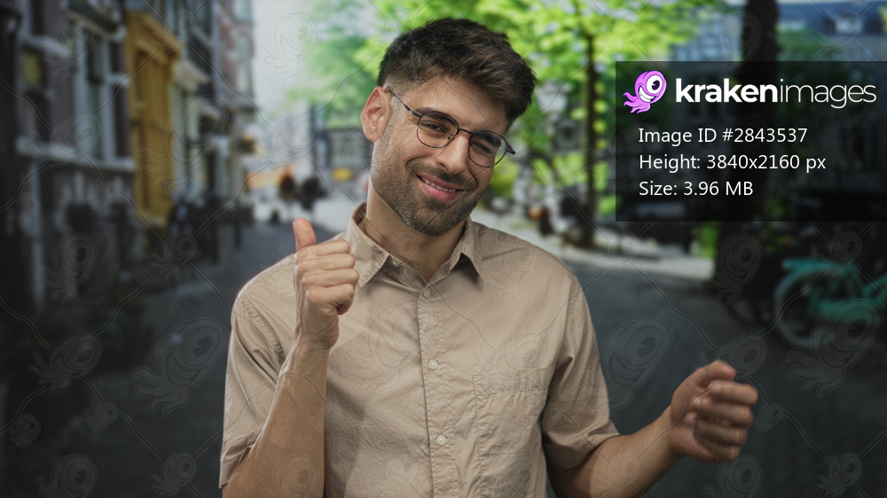 Young hispanic man in beige shirt with open palms on bustling city street in daylight; friendly welcome.