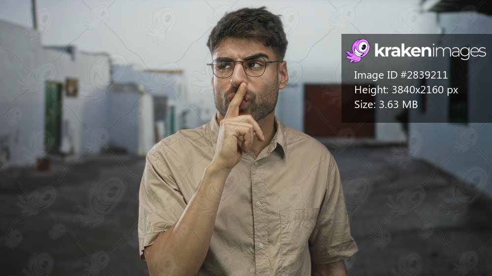 Young hispanic man in beige shirt presses finger to lips on a street beside white buildings; quiet reflection.