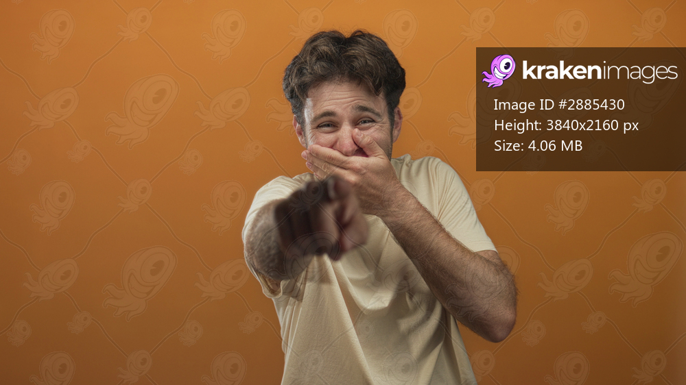 Young hispanic man in beige t shirt points finger and covers mouth with hand while pointing at camera in orange studio; playful surprise.