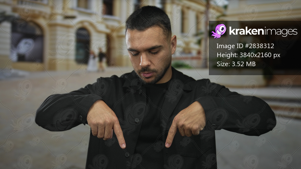 Young hispanic man in black shirt points both fingers down on urban street next to historic building; attention.