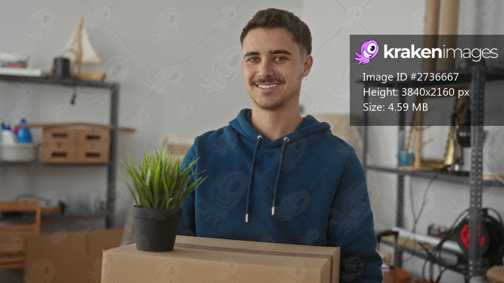Young hispanic man in blue hoodie holds cardboard box with potted plant in modern living room filled with other boxes indicating moving process.