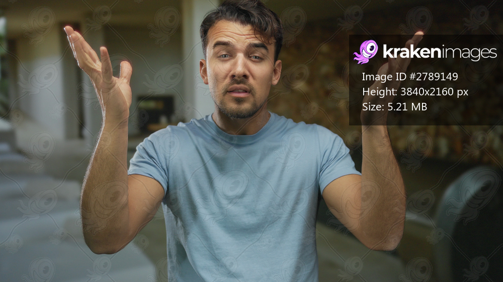 Young hispanic man in blue shirt expressing confusion indoors at spa pool setting with arms raised, conveying contemplation in a serene atmosphere.