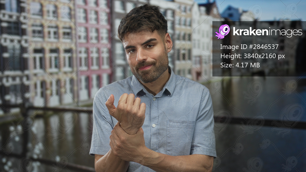 Young hispanic man in blue shirt holding wrist on busy urban street near canal buildings; inner resilience.