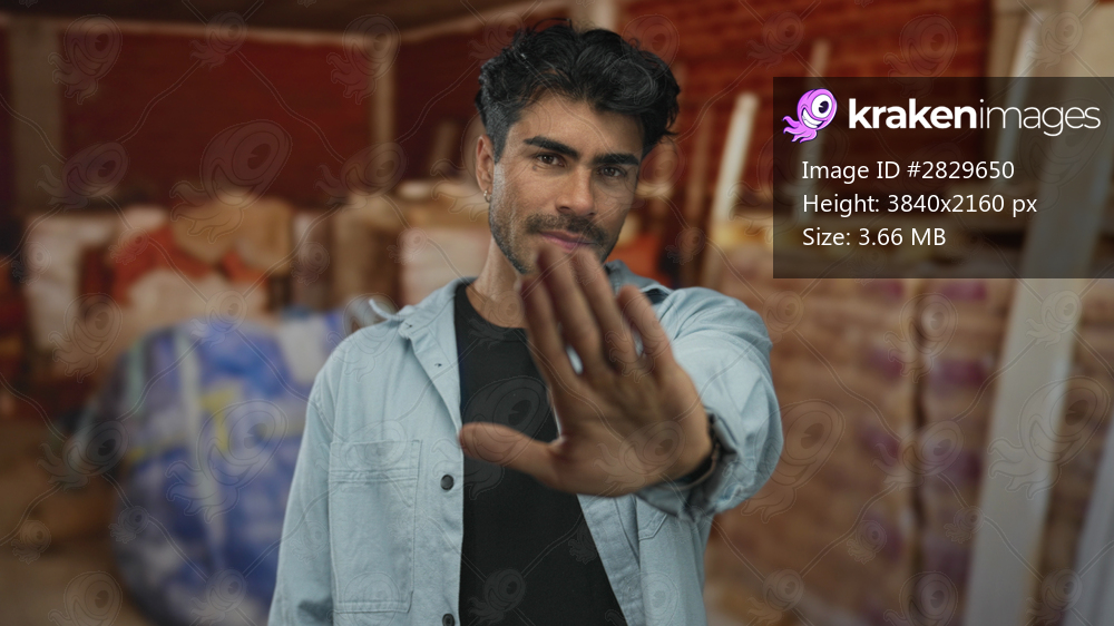 Young hispanic man in blue shirt holds palm to camera inside building lined with bricks and scaffolding; frustration tension stress exasperation.