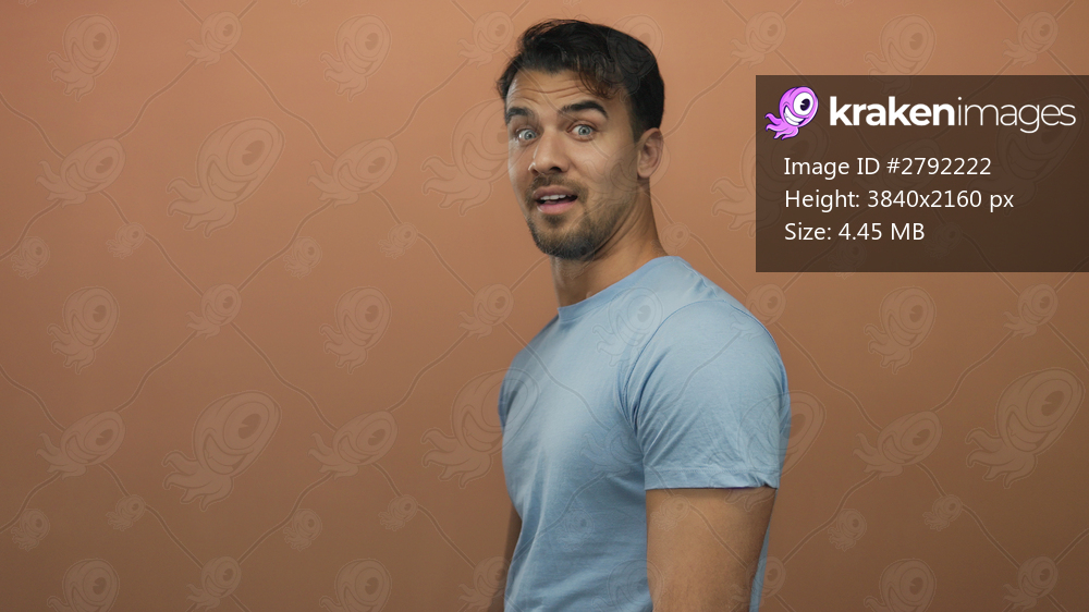 Young hispanic man in blue shirt making excited expressions against brown background, showcasing positive and surprised emotions.