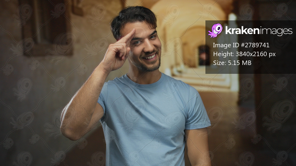 Young hispanic man in blue shirt saluting outdoors at historic university corridor