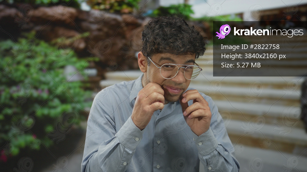 Young hispanic man in blue shirt touches chin outdoors on building stairs with lush foliage around; doubt.