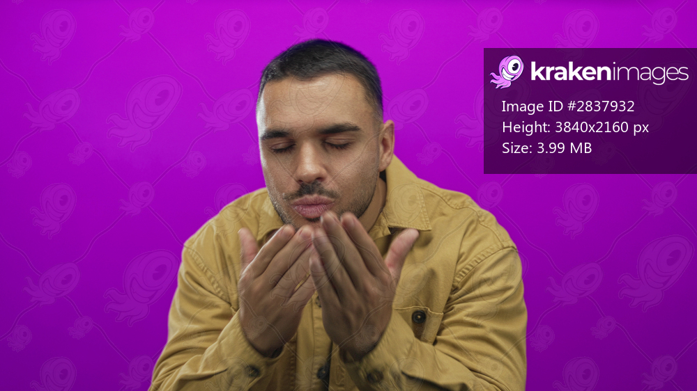 Young hispanic man in brown shirt closes eyes and blows kiss against magenta studio backdrop; affection warmth.