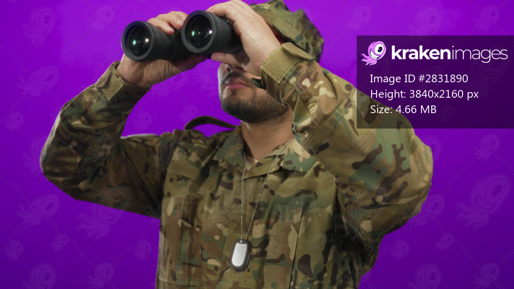 Young hispanic man in camouflage army uniform with dog tag looks up in purple studio; pride duty courage honor.