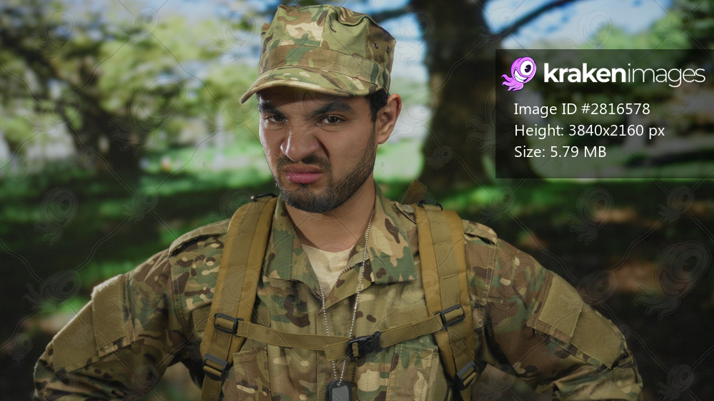 Young hispanic man in camouflage military uniform grips hands near chest amid green forest scenery; disgust.