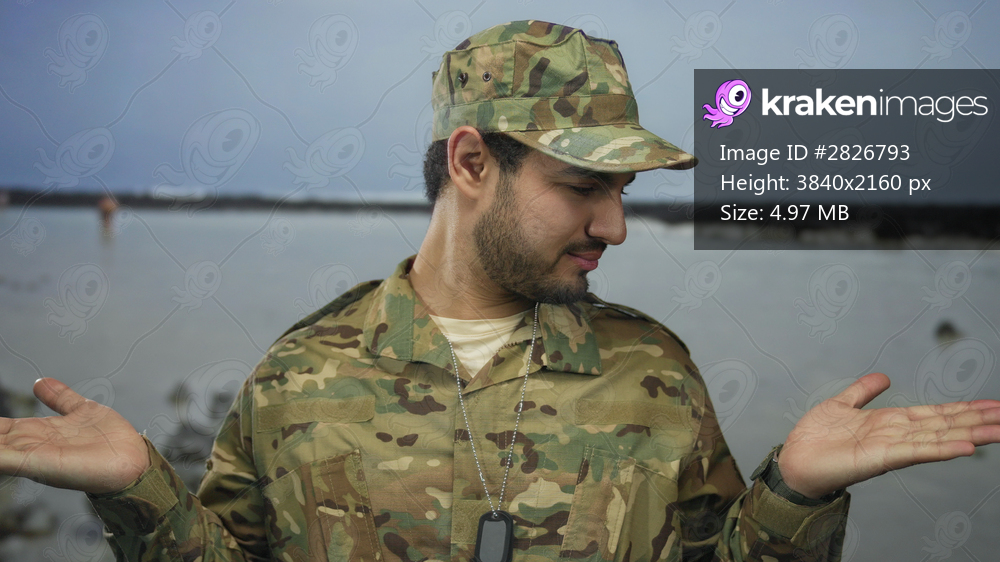 Young hispanic man in camouflage military uniform stands on street with both palms up shrug gesture facing the camera; uncertainty.