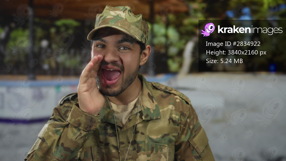 Young hispanic man in camouflage uniform cups hands over mouth for loud shout in street; duty courage.