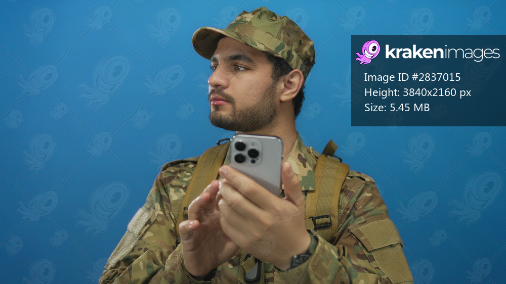 Young hispanic man in camouflage uniform taps smartphone screen with fingertips intently in blue studio; duty.