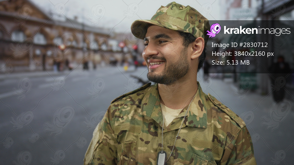 Young hispanic man in camouflage uniform wearing dog tags smiling broadly while walking on busy city street lined with historical buildings; pride duty. - Kraken Images