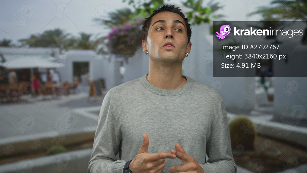 Young hispanic man in casual attire gestures with confidence outdoors against a blurred background of a lively street with palm trees and white buildings. - Kraken Images
