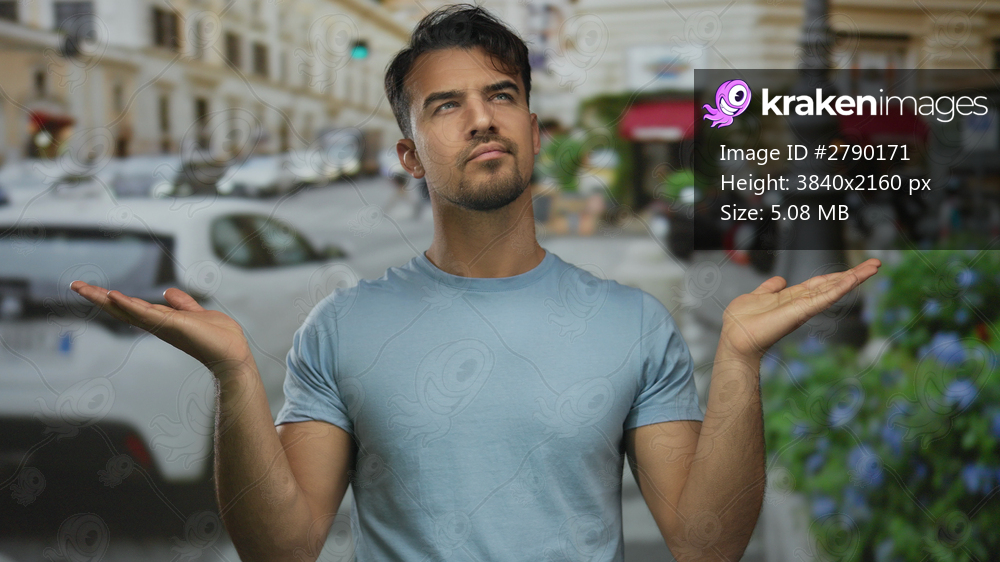 Young hispanic man in casual blue shirt stands on busy city street, gesturing with both hands in expression of confusion or decision-making outdoors in urban environment. - Kraken Images