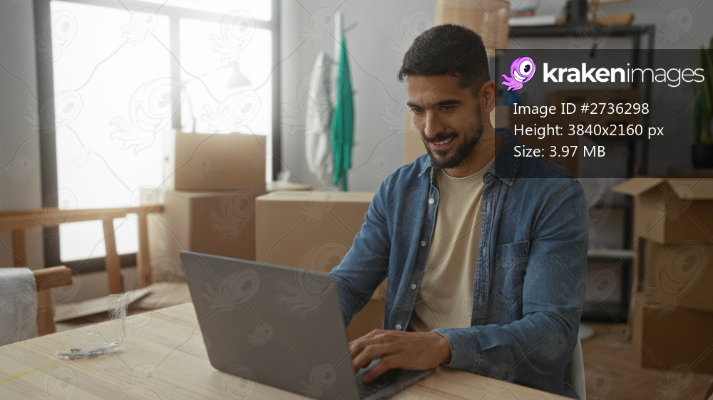 Young hispanic man in casual clothes works on laptop surrounded by moving boxes in new home living room setting.