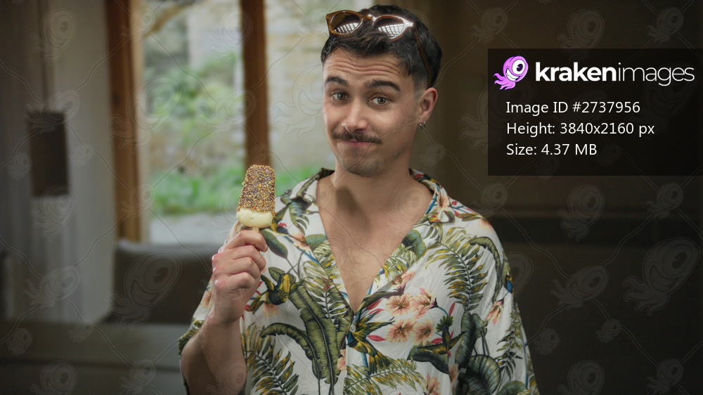 Young hispanic man in casual shirt enjoys ice cream indoors at hotel showcasing tourism and leisure