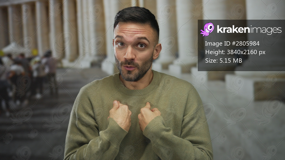 Young hispanic man in casual sweater gestures at old university campus corridor with curiosity and engagement.