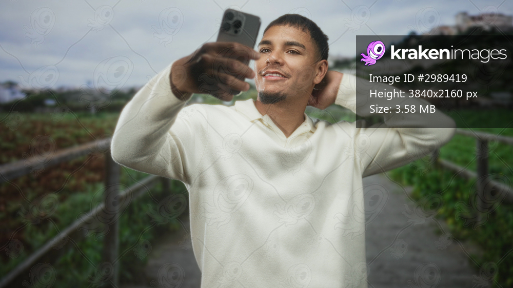 Young hispanic man in cream sweater holding smartphone for selfie on street by wooden railing, arm raised and hand visible, smiling; contentment moment. - Kraken Images