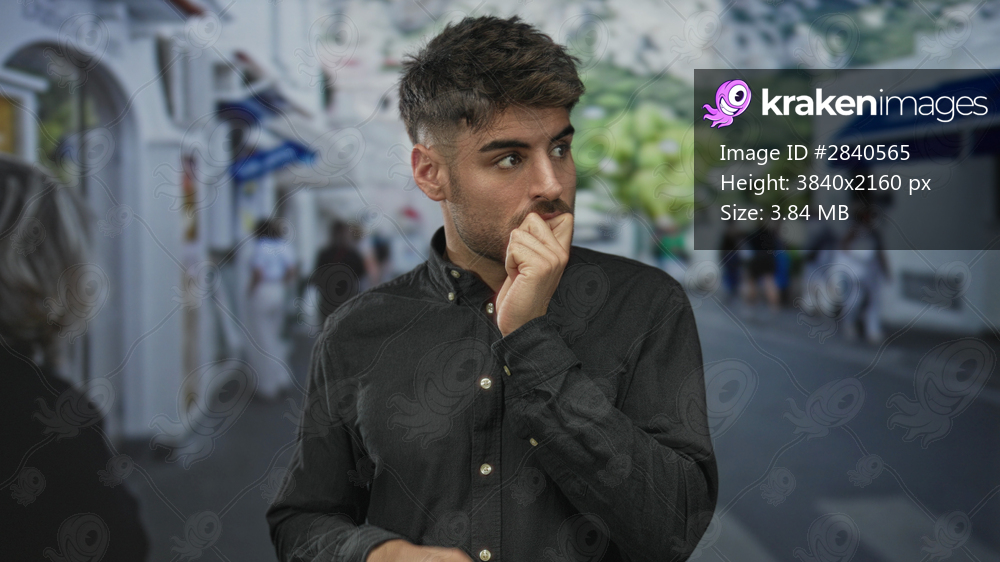 Young hispanic man in dark shirt clenches fists near chin in street with blurred pedestrians behind; anxiety.
