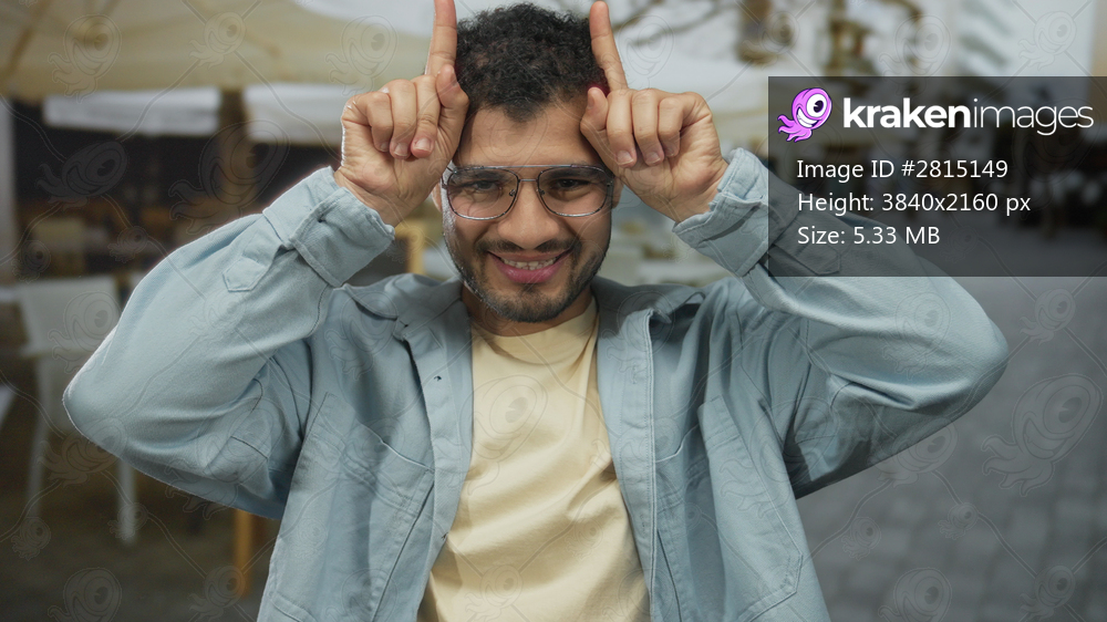 Young hispanic man in denim blue jacket and glasses finger pointing to head at sunlit restaurant terrace smiling broadly; amusement.