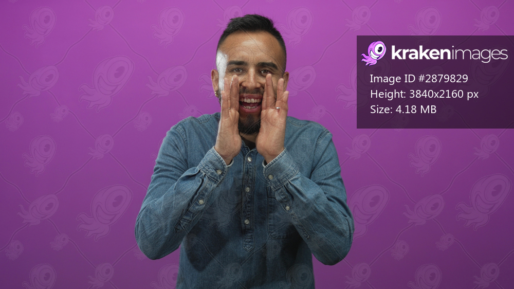 Young hispanic man in denim shirt cupping hands to mouth shouting in purple studio; announcement excitement.