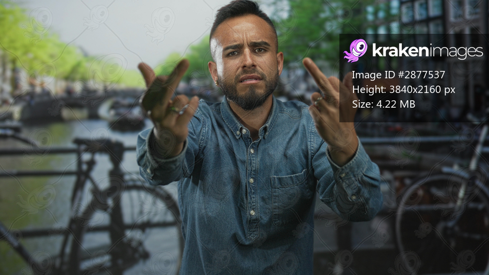 Young hispanic man in denim shirt raising middle fingers toward camera on a street by an amsterdam canal; anger defiance.