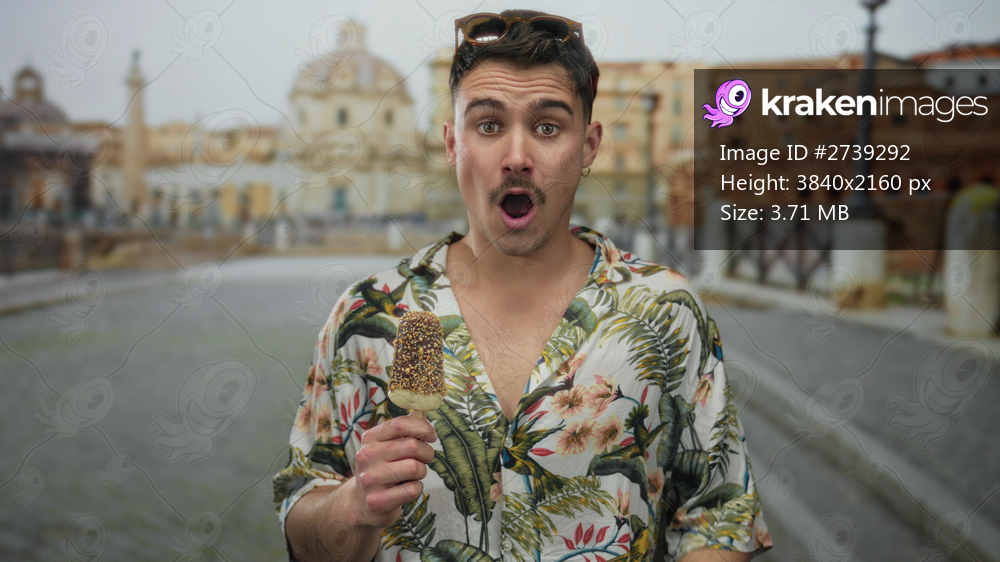 Young hispanic man in floral shirt holding ice cream, surprised in front of roman ruins on a sunny day, showcasing travel and outdoor enjoyment.