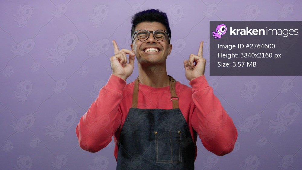 Young hispanic man in glasses and apron points upward smiling against a solid purple background, wearing a red sweater, expressing joy and positivity in a studio portrait. - Kraken Images