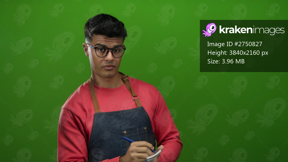 Young hispanic man in glasses and apron takes notes against an isolated green background, capturing a professional and focused demeanor of a waiter in action. - Kraken Images