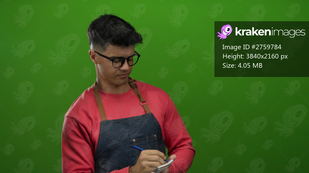 Young hispanic man in glasses and apron takes notes against an isolated green background, capturing a professional and focused demeanor of a waiter in action. - Kraken Images