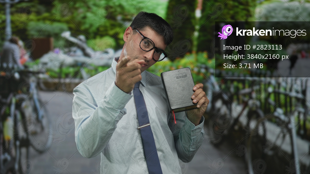 Young hispanic man in glasses beckons with hand while holding notebook on street; invitation welcome.