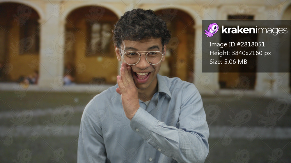 Young hispanic man in glasses cups hand to mouth in front of old stone building under daylight; joy secret.